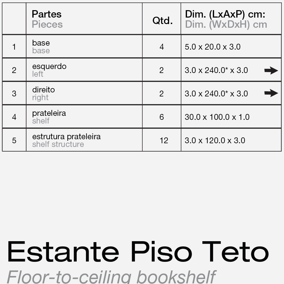 A estante Piso-teto abusa do óbvio para trazer um design clean e estável. Pensada para aproveitar os pontos de fixação no piso e no teto, ela se mantém firme em seu lugar. Com essa fixação, ganhamos leveza ao não precisar de peças para travar os eixos. O resultado: um design limpo, leve e que tira suspiros.