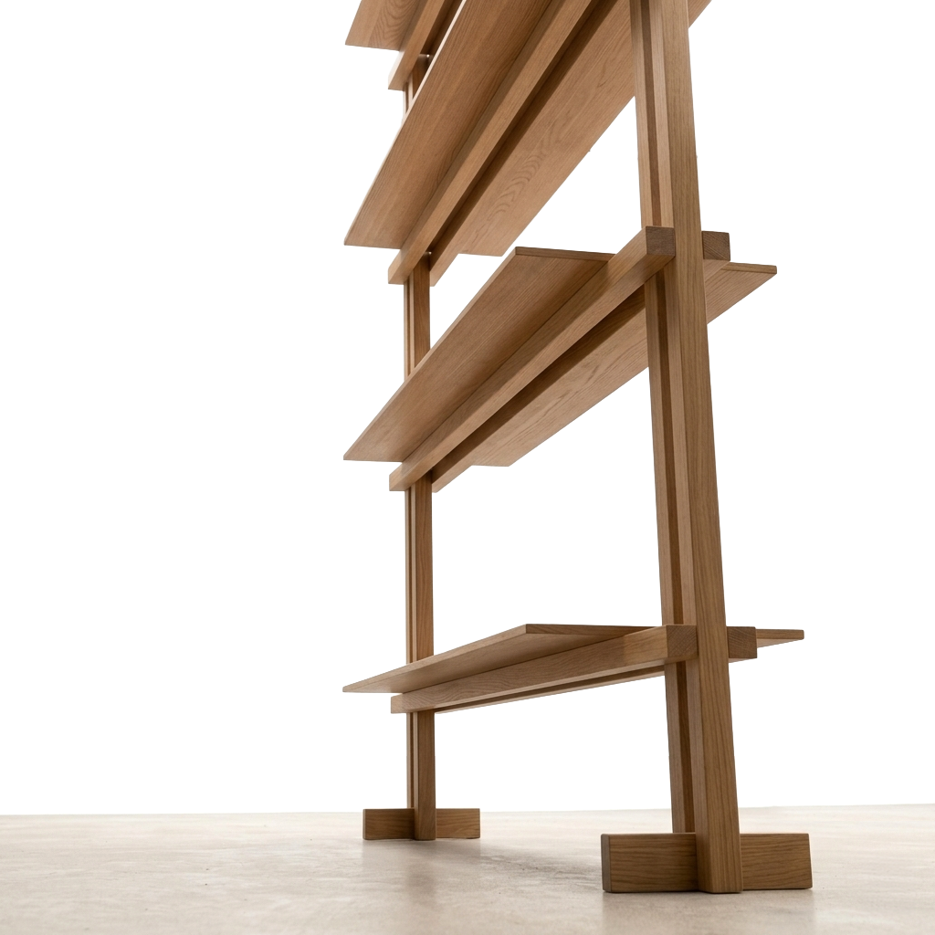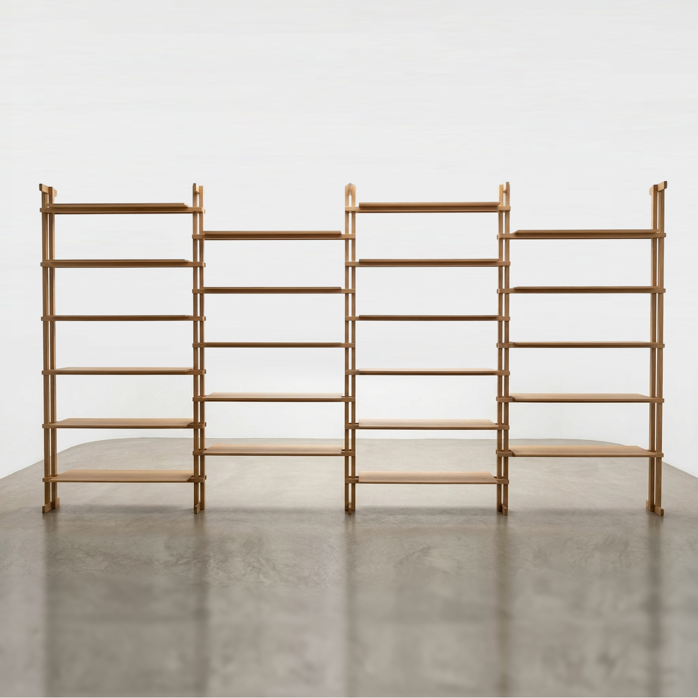 Ainda por cima, seu desenho prima por economia de elementos. O modelo todo é feito com 4 cortes de madeira, sendo que dois deles são ripas quadradas de madeira com 3cm de aresta. As prateleiras, tábuas com 30cm de largura. Quer mais? Ela é modular, o que significa que você pode criar uma parede inteira com estantes Piso-Teto, sempre aproveitando as peças do móvel vizinho para prender o próximo.
